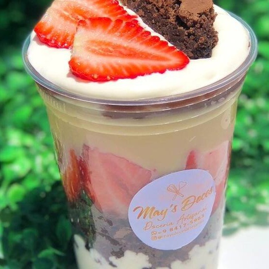 Creme especial de Ninho, pedaços de brownie, morangos frescos, brigadeiro cremoso de Ninho e brigadeiro cremoso 50%.