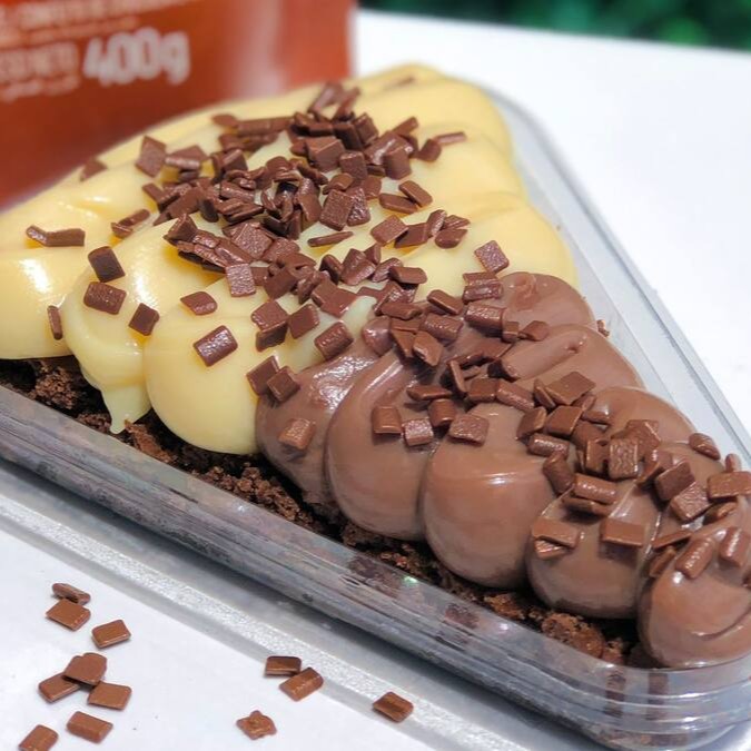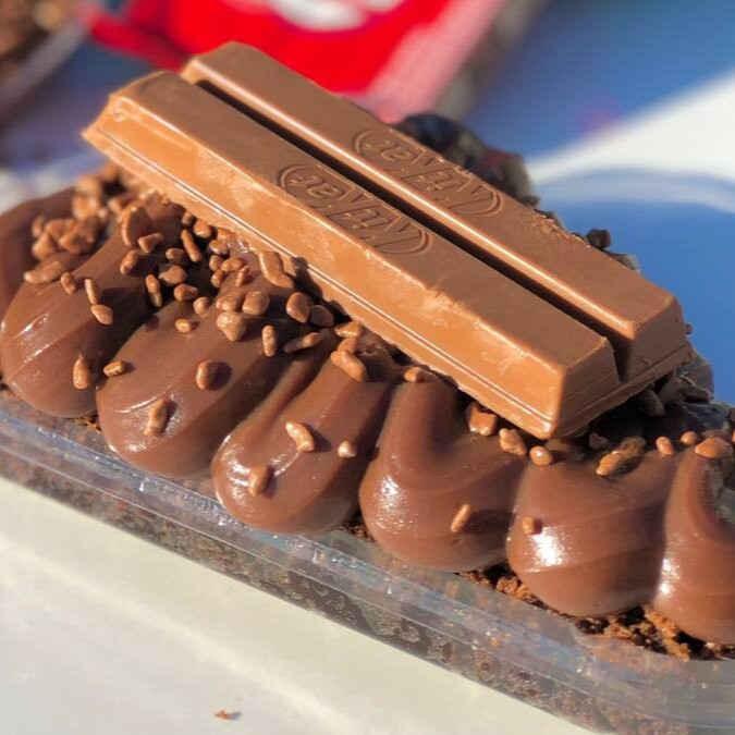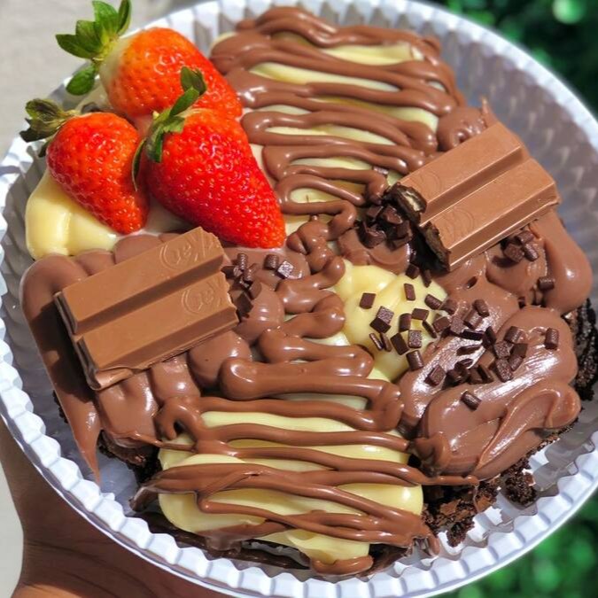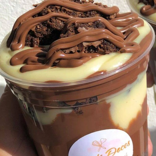 Creme especial de Ovomaltine, pedaços de brownie, brigadeiro cremoso 50%, flocos crocante de Ovomaltine e Kitkat.
