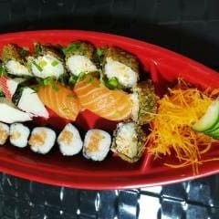 4 sashimi de salmão, 2 niguiris de salmão, 2 niguiris de kani, 5 kani queijo, 12 cariocas de salmão, 10 hossomakis de salmão e 10 uramakis de kani