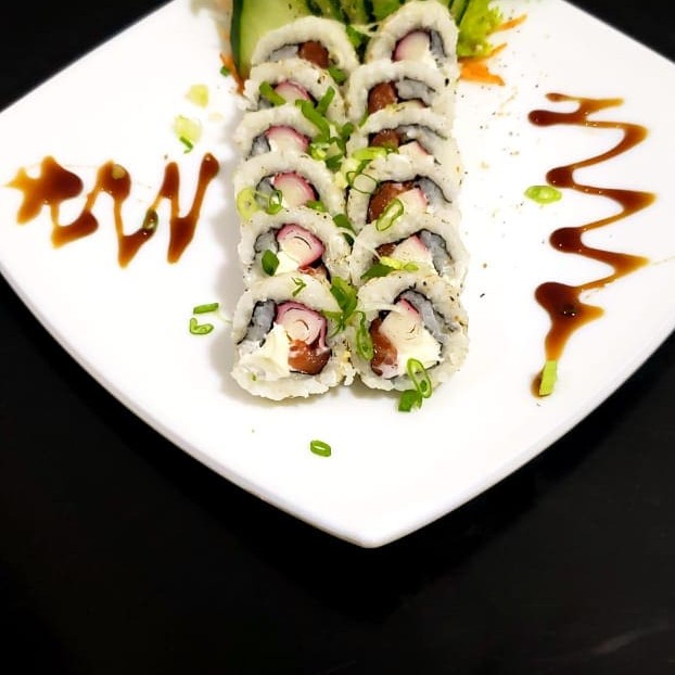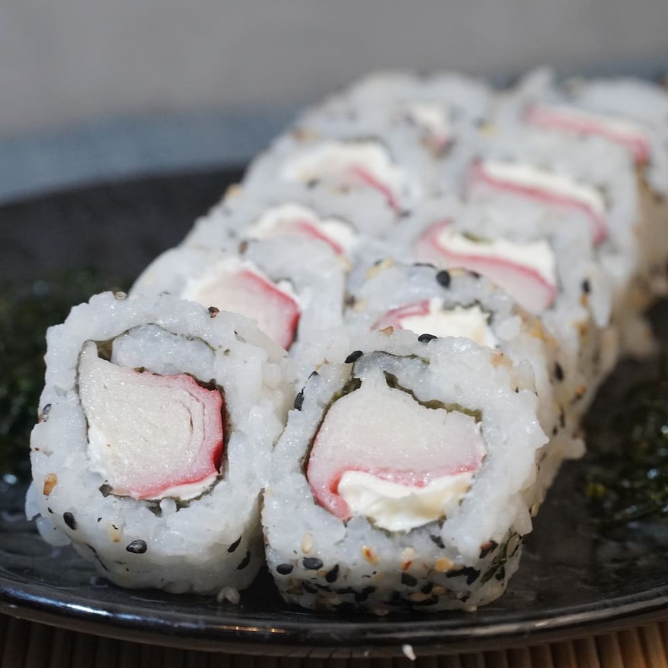 Enrolado de arroz por fora com recheio de kani e cream cheese. Finalizado com cebolinho e gergelim.