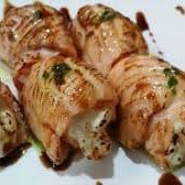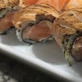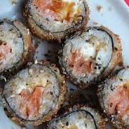 Enrolado de arroz por fora com recheio de salmão, cream cheese envolto por uma lâmina de salmão maçaricada.
