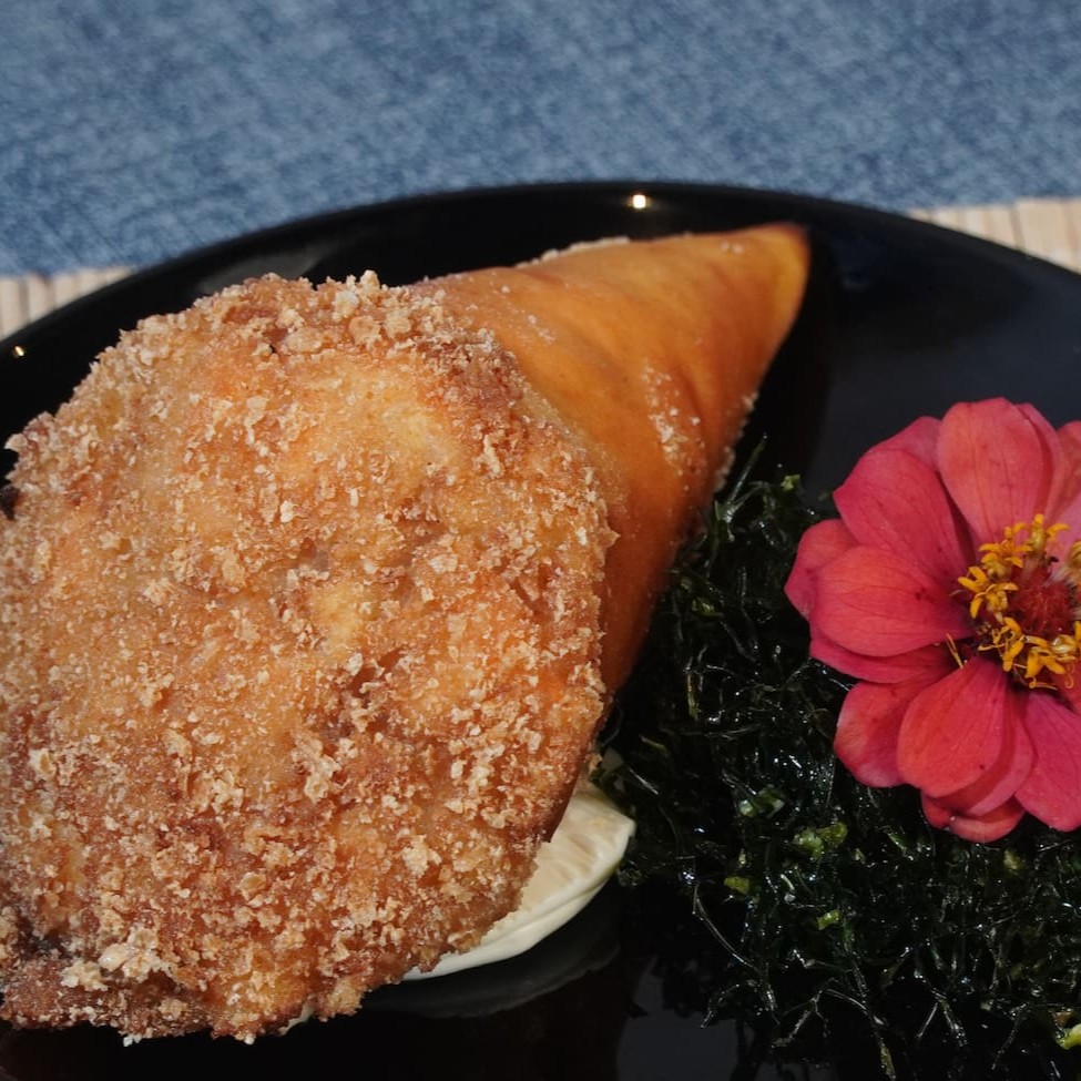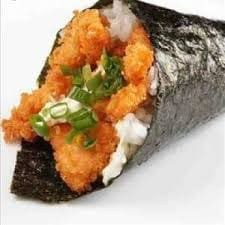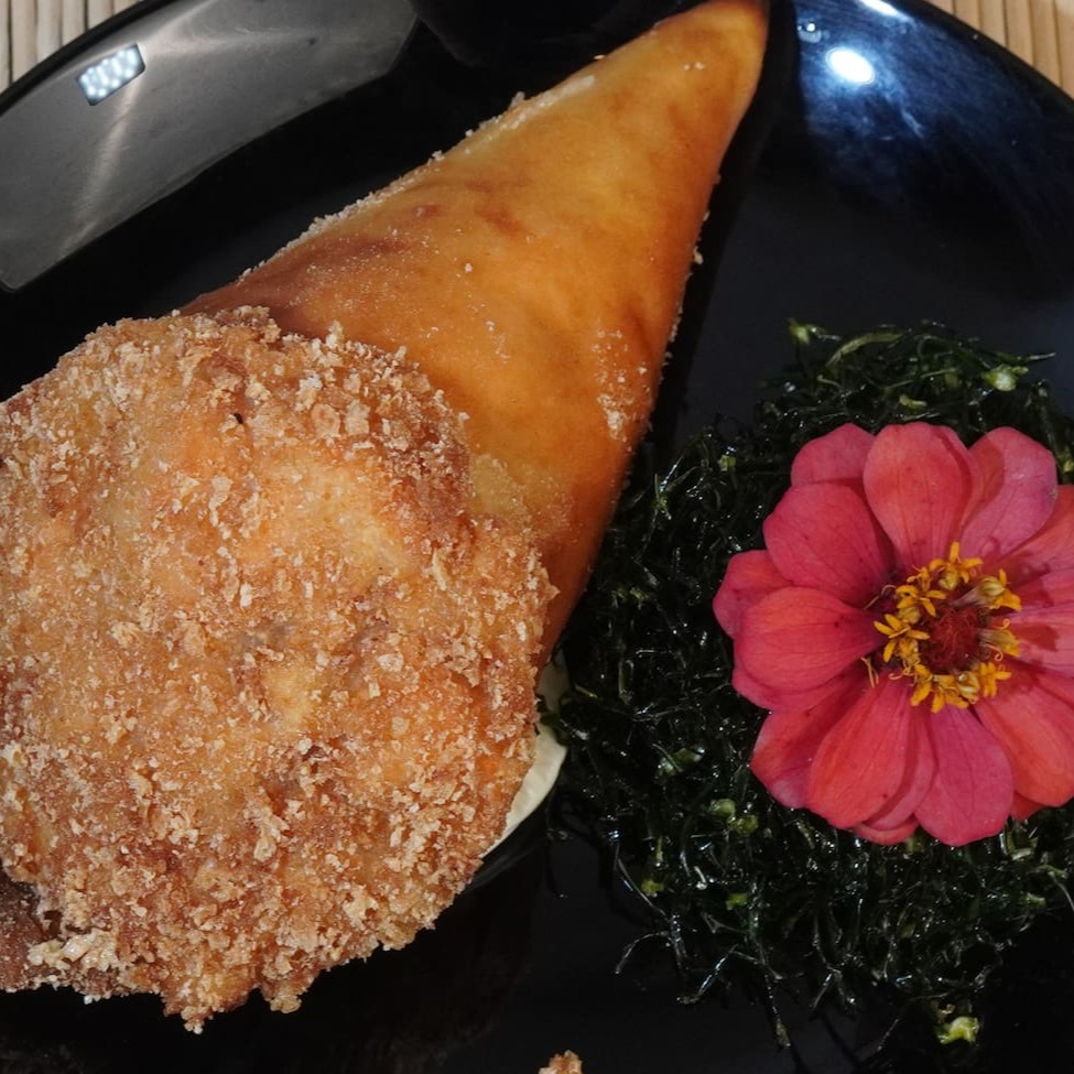 Temaki na massa de harumaki (empanado e frito), cream cheese e kani. Servido com cebolinho