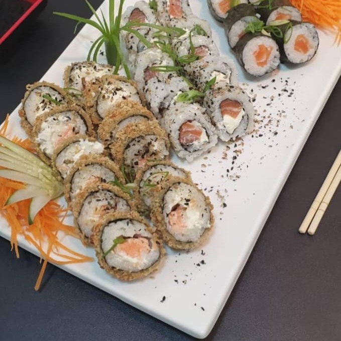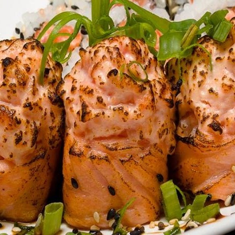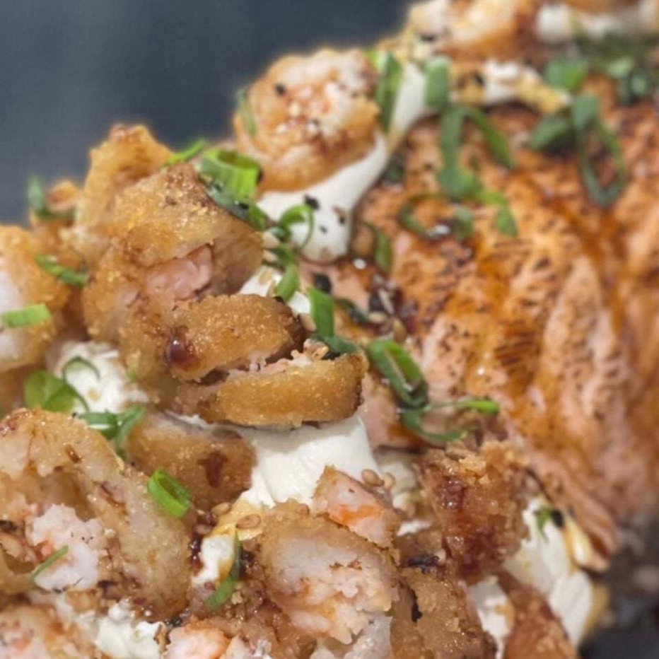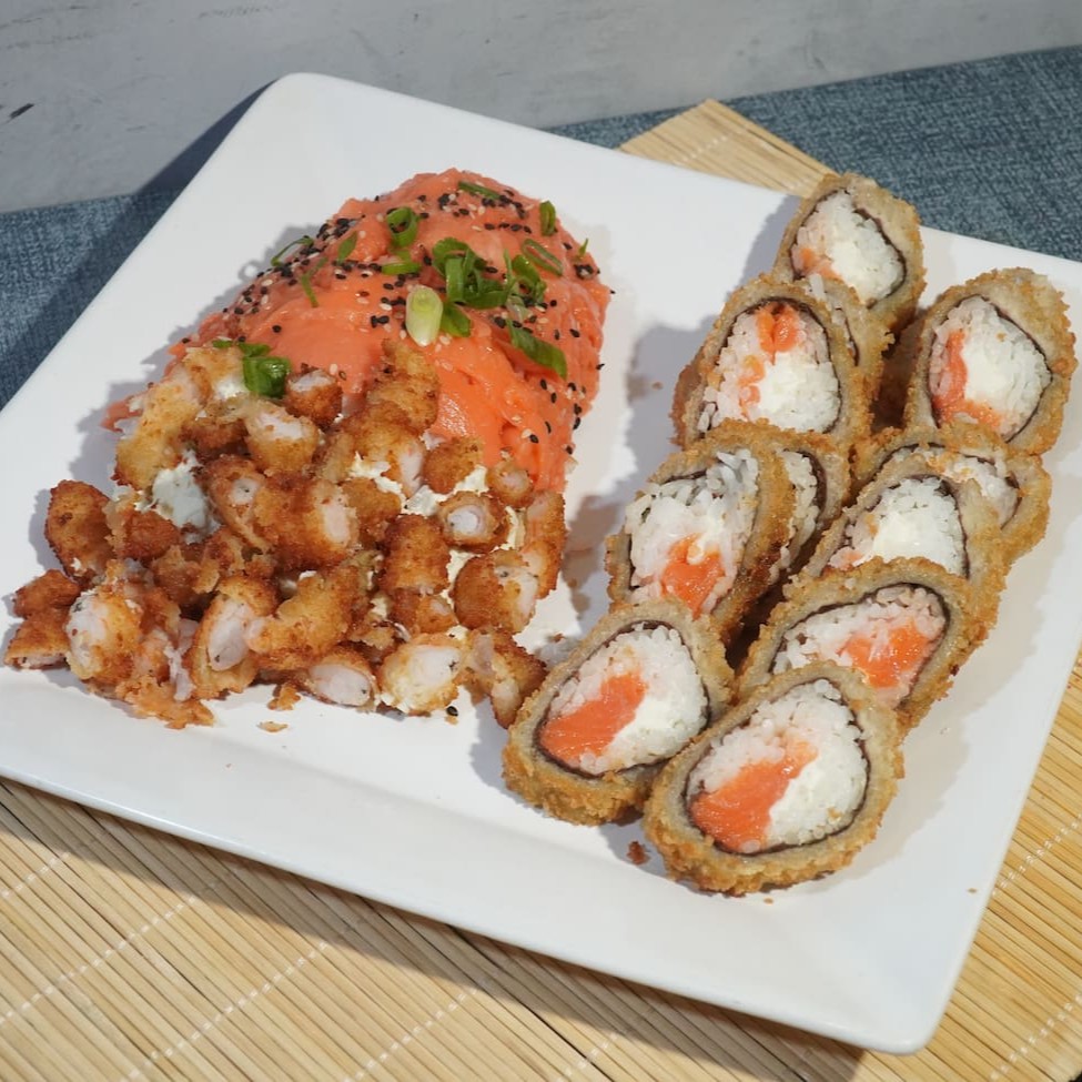 Arroz com recheio de camarão empanado, skin de salmão ou kani empanados, cream cheese e coberto por uma manta de salmão maçaricado. Servido com cebolinho e gergelim.