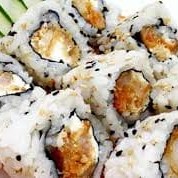 Enrolado de arroz por fora com recheio de camarão empanado e cream cheese. Finalizado com cebolinho e gergelim.