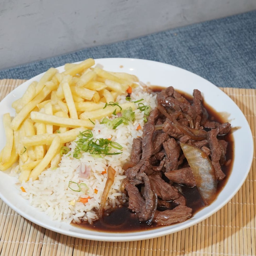 Arroz chop suey, recheado de legumes e tiras de carnes fritas ao molho shoyu, acompanhado de batatas fritas