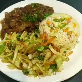 Arroz chop suey, recheado de cebolas pré fritas e tiras de carnes fritas ao molho shoyu
