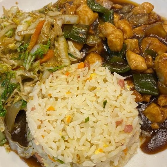Arroz chop suey, recheado de legumes e tiras de frango fritos ao molho shoyu