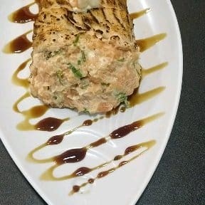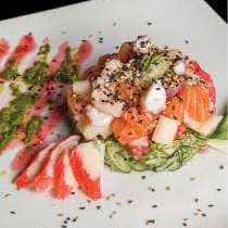 Arroz com uma pasta temperada de salmão, cobertos por uma manta de salmão maçaricado. Servido com cebolinho e gergelim.