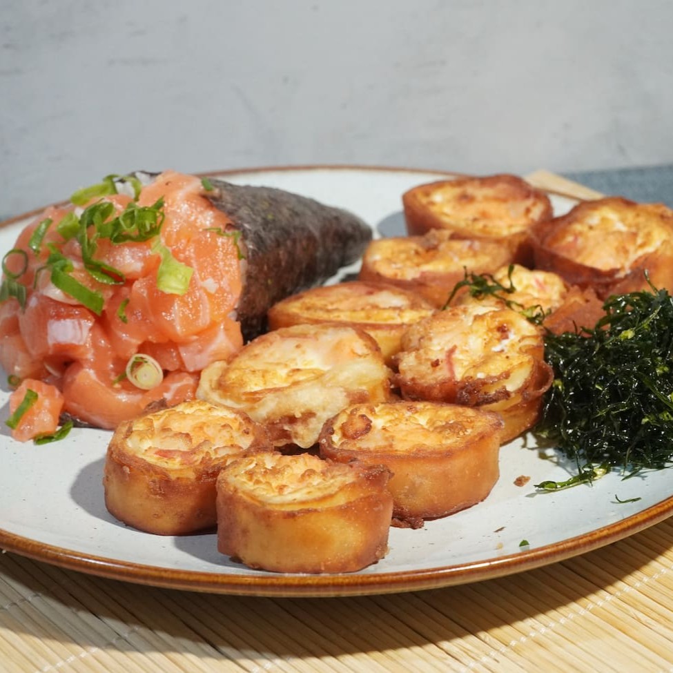 Enrolado frito de alga com arroz, cream cheese e salmão. Servido com cebolinho e gergelim