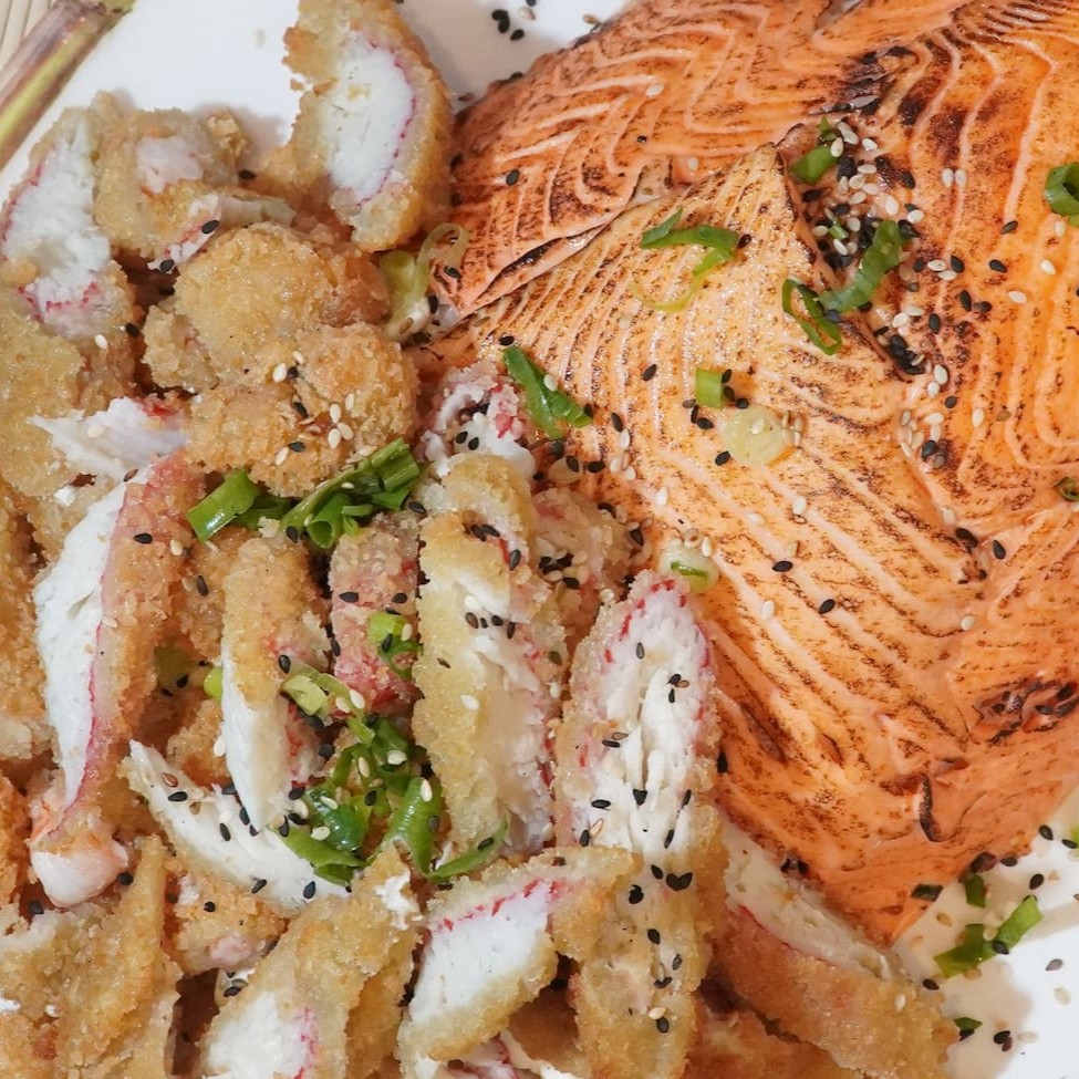 Lâmina de salmão maçaricada, arroz e recheio de camarão com cebolinho e gergelim