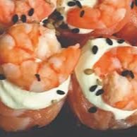 Camarão empanado e cream cheese. Envolvido por uma lâmina de salmão maçaricada. Servido com cebolinho e gergelim