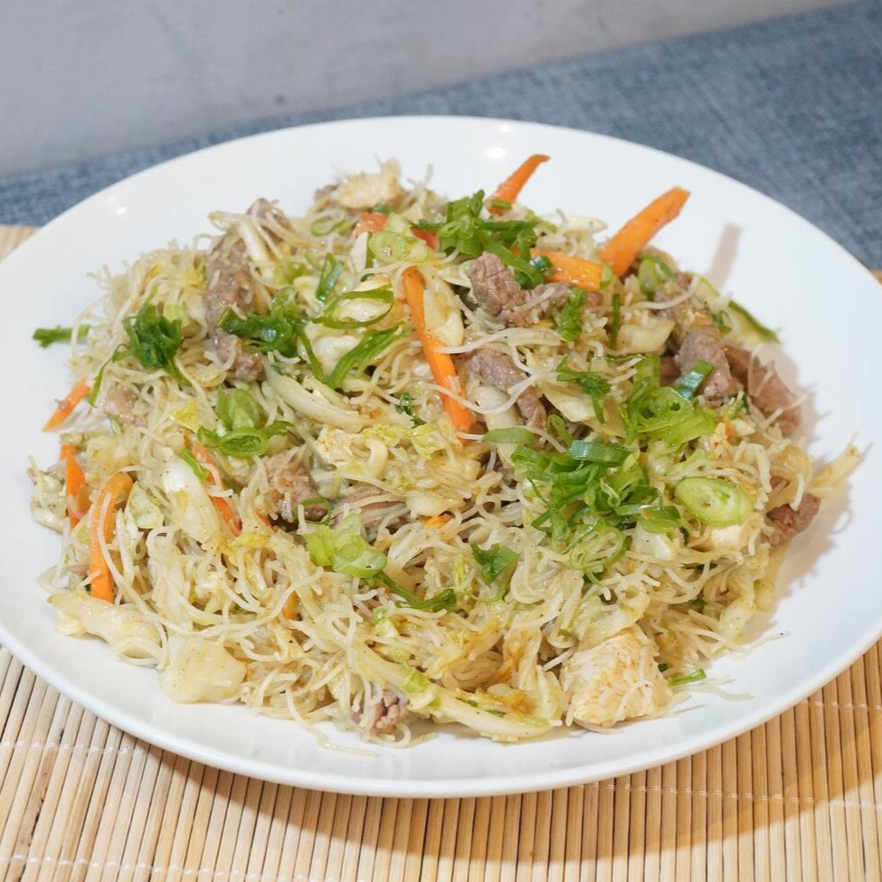 Macarrão bifum recheado de carne, frango, ovos e legumes ao molho curry