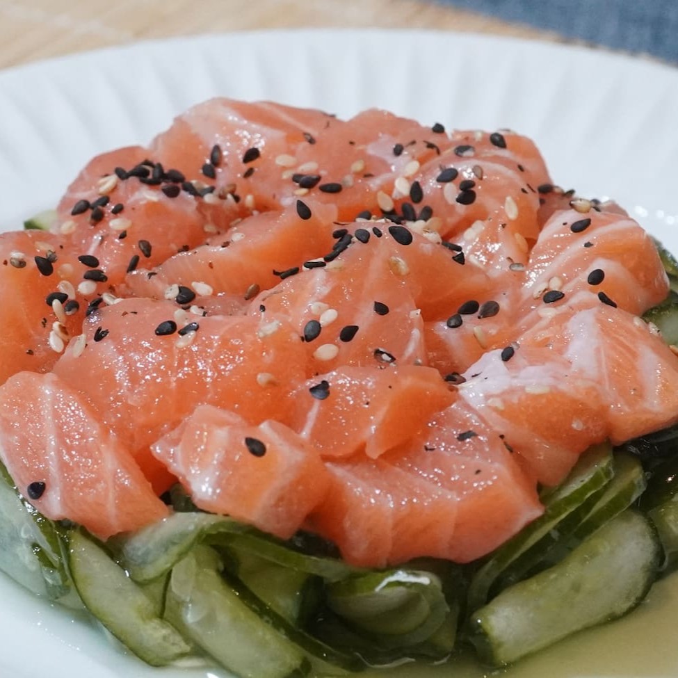 Porção de pepinos, cubos de salmão e gergelim