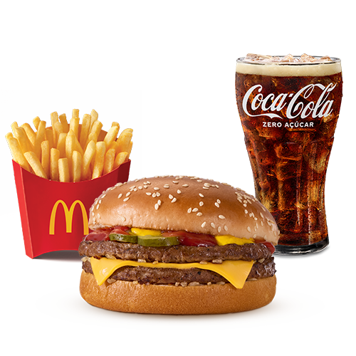 Um hambúrguer (100% carne bovina), queijo cheddar, picles, cebola, ketchup, mostarda e pão com gergelim, acompanhamento e bebida.