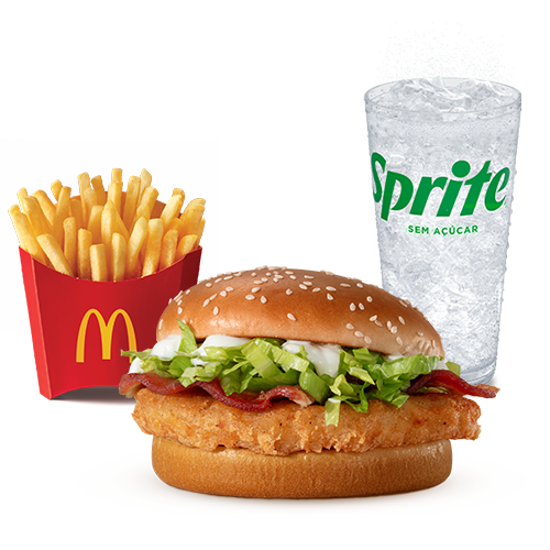 Frango empanado, maionese, bacon, alface americana e pão com gergelim, acompanhamento e bebida.