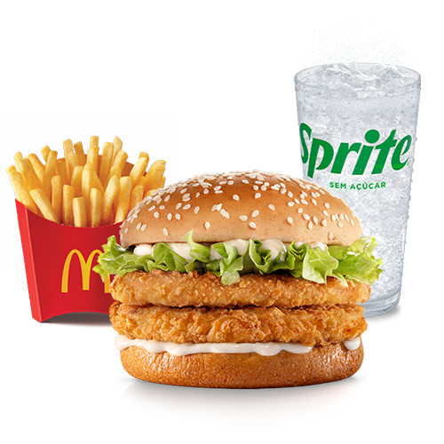 Composto por dois empanados com frango, maionese, alface americana e pão com gergelim, acompanhamento e bebida.