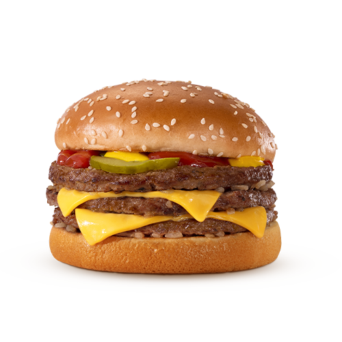 Três hambúrgueres (100% carne bovina), queijo cheddar, cebola, picles, ketchup, mostarda e pão com gergelim
