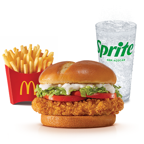 Sanduíche composto pelo novo pão do Méqui, peito de frango temperado empanado, maionese, alface américa e tomate, acompanhamento e bebida.