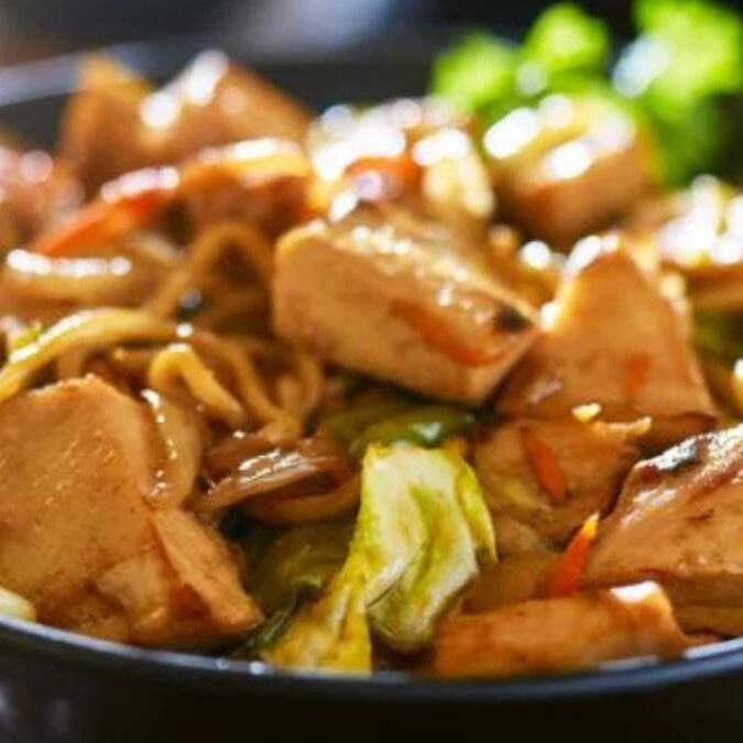 Filé de peito de frango, legumes refogados no alho (Acelga, Cenoura, Cebola e Repolho), molho oriental à base de Shoyu, macarrão artesanal próprio para yakisoba.