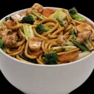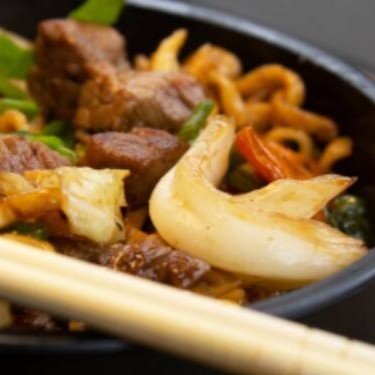 Carne bovina, filé de peito de frango, legumes refogados (Acelga, Cenoura, Cebola e Repolho), molho oriental à base de Shoyu, macarrão artesanal.