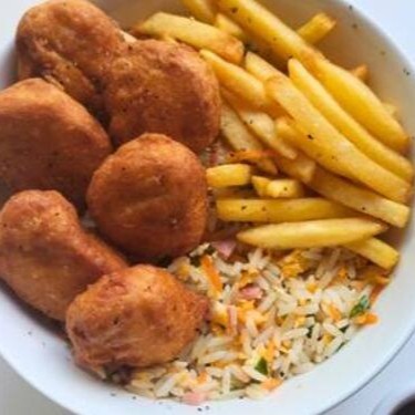 Nuggets de frango bem temperadinhos, servidos com um delicioso arroz yakimesh (arroz, cenoura, presunto, ovos, cebolinho, oleo de gergelim e tempero) acompanha batata frita e molho Barbecue.