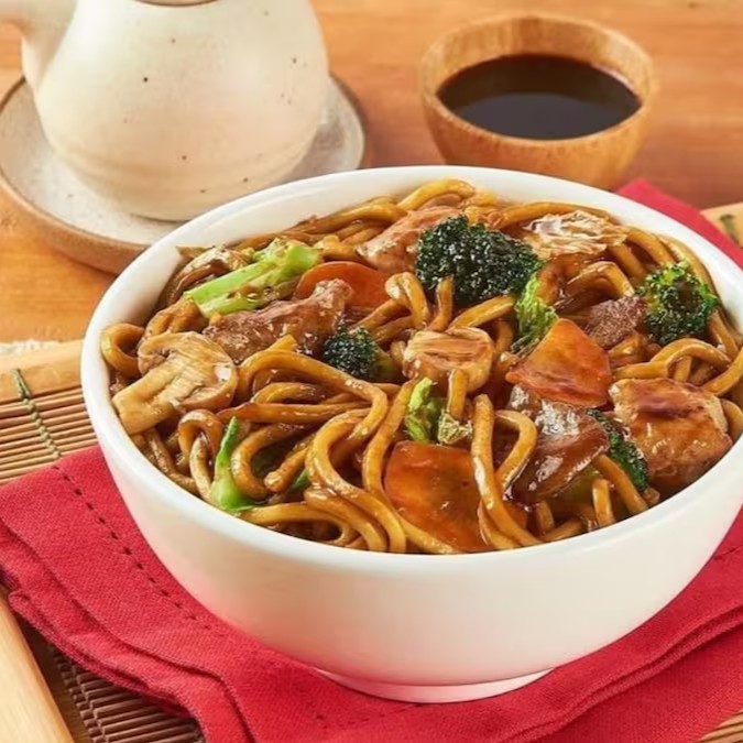 Molho oriental servido com macarrão artesanal especial, carne bovina (coxão mole), filé de peito de frango, legumes refogados com alho, oléo de soja e Saquê Mirin (cenoura, cebola, repolho e acelga). Finalizado com cebolinho e gergelim torrado