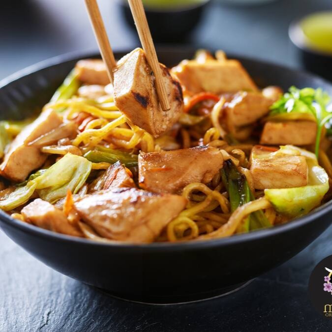 Nosso delicioso yakisoba é feito com molho a base de shoyu, filé de frango, cenoura, cebola, repolho e acelga refogados com olho de gergelim, alho e Saquê.