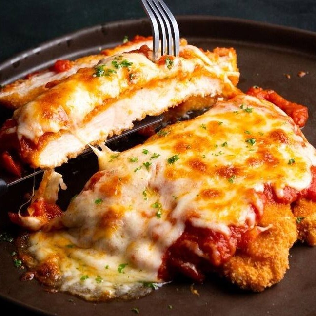 Parmegiana de Frango, servida com molho de tomate, queijo muçarela, espaguete ou arroz de cenoura. Acompanha batata frita e Coca Cola lata 350ml