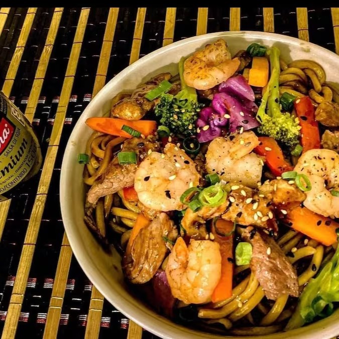 Descubra o nosso Yakissoba Especial, uma obra-prima culinária de 500gramas, preparada meticulosamente para uma pessoa. Este prato é composto por suculenta carne bovina, frango tenro e camarão fresco, todos envoltos em uma mistura vibrante de legumes crocantes. Cada ingrediente é cuidadosamente salteado e depois banhado em nosso autêntico molho shoyu, que adiciona uma deliciosa camada de sabor umami. Este Yakissoba é mais que apenas uma refeição, é uma experiência de sabor inigualável, que certamente irá satisfazer e encantar o seu paladar. #Yakissobaespecialista #Yakissobadelicioso