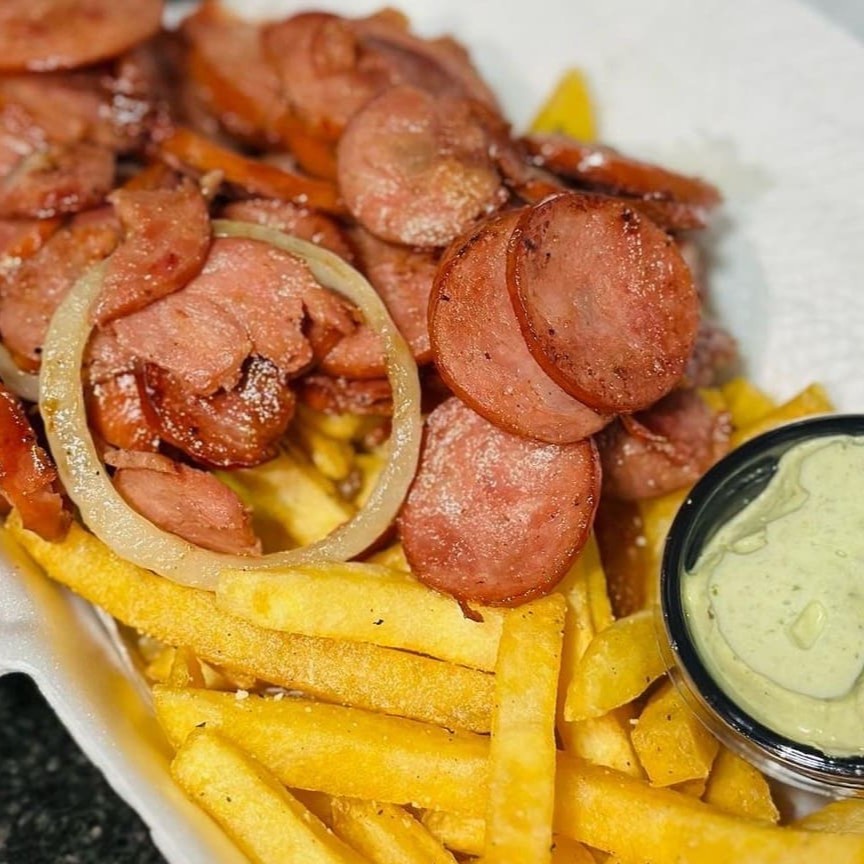 150 G de calabresa acebolada acompanhada de 150 g de batata e nosso molho de bacon