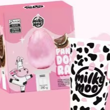 Almofada na cor de fundo preta sendo uma face com a logo e a outra com a Vaquinha Moo.