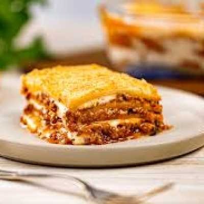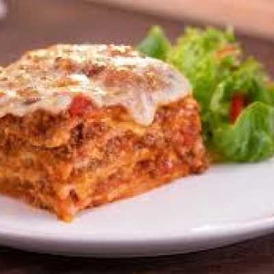 com camadas de massa leve, carne bolonhesa bem temperada, presunto, muito queijo e molho de tomate caseiro.