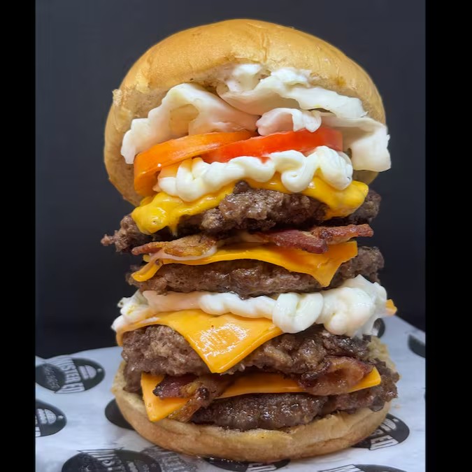 (pão brioche com mix de gergelim,4 blends de 100g (400g),4x queijo cheddar,bacon,2xcatupiry,Repolho crocante,alface e molho especial)