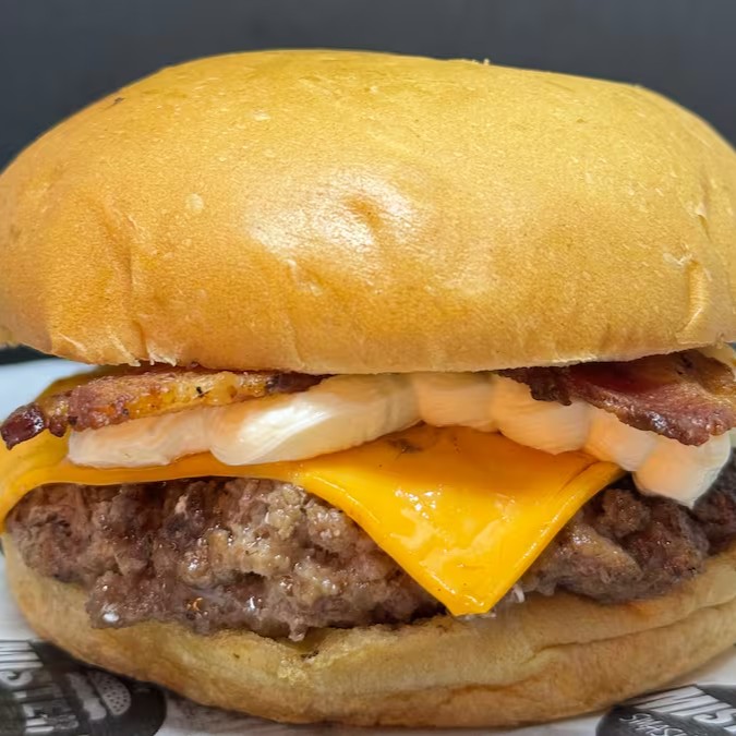 Delicioso Pão Brioche,1 carne artesanal 100g, 1 Fatia de Queijo Cheddar Polenghi , Creamcheese Polenghi , Bacon e Molho no topo.