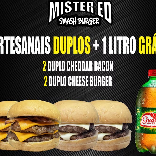 Prepare-se para uma experiência gastronômica incrível com nossa promoção especial que traz 4 hambúrgueres artesanais duplos e um refrescante Refrigerante Antártica de 1 litro! É a combinação perfeita para satisfazer sua fome e alegrar seu Dia!