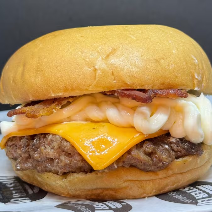 (pão de brioche com mix de gergelim ,2 blends bovinos de 100g cada (200g) ,2 fatias queijo , molho de cheddar Polenghi, 2 fatias de bacon crocante e molho especial)