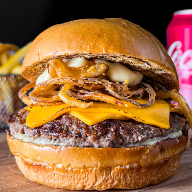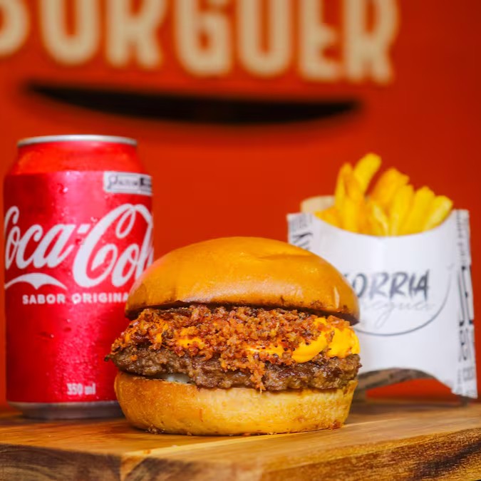 cocgenerosas fatias de cheddar derretido, perfeitamente equilibradas pela crocância da nossa cebola 'cryph'. O prato é coroado com uma porção individual de batatas fritas crocantes e douradas, acompanhadas de uma refrescante lata de Coca-Cola. A combinação perfeita para um deleite completo e saboroso! Com coca cola