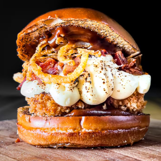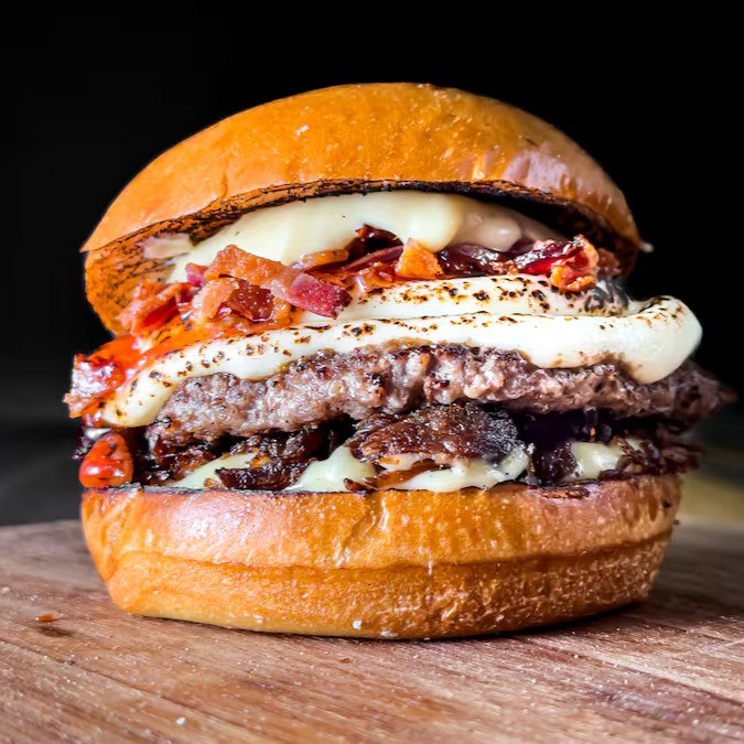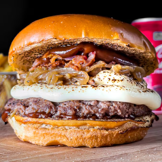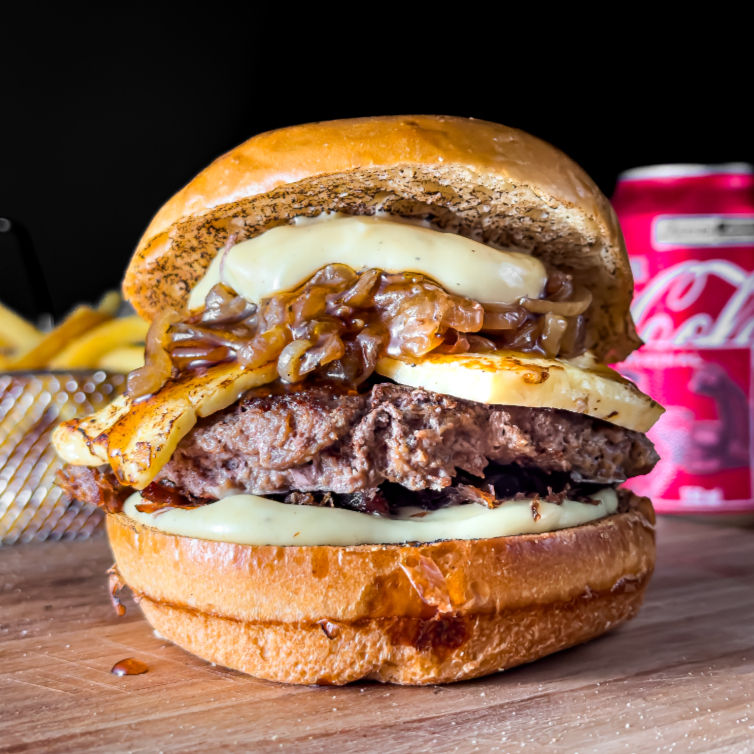 Delicie-se com o nosso Good Cream! Hambúrguer de 120g, coberto com requeijão maçaricado, criando uma crocância externa e cremosidade interna. A cebola chapeada, caramelizada à perfeição, traz um toque doce, enquanto a farofa de bacon crocante adiciona sabor salgado e textura irresistível. Finalizado com molho barbecue defumado e adocicado, esse hambúrguer é um verdadeiro clássico, repleto de sabor e requinte em cada mordida.
