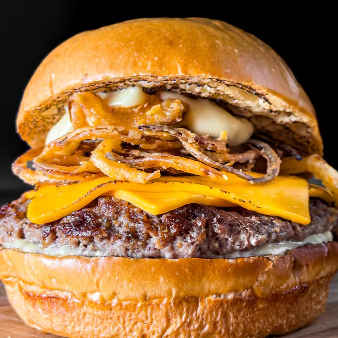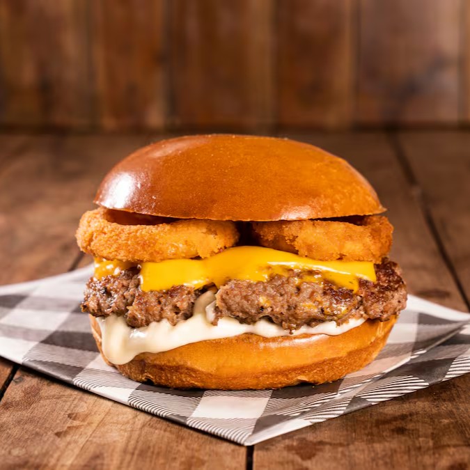 pao brioche amanteigado , blend de carne , queijo cheddar ,onion rings maionese da casa e cebola chapeada