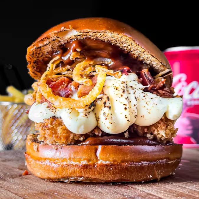 Delicioso pão brioche amanteigado recheado com suculenta sobrecoxa de frango empanada na crocante farinha panko, coberta com cremoso cream cheese maçaricado e crysp de cebola. Acompanha irresistível farofa de bacon e molho barbecue para finalizar com chave de ouro. Uma explosão de sabores em cada mordida! + fritas + Coca-Cola lata