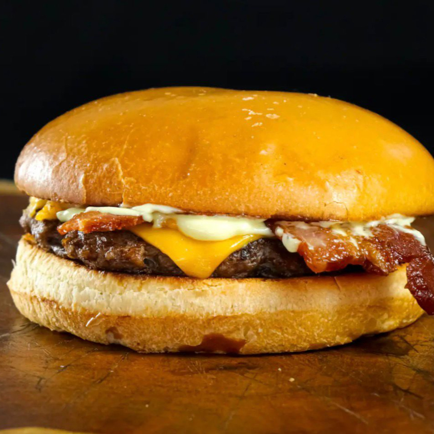 Pão brioche amanateigado , carne de Smash 80 g cheddar, bacon fatiado , maionese da casa