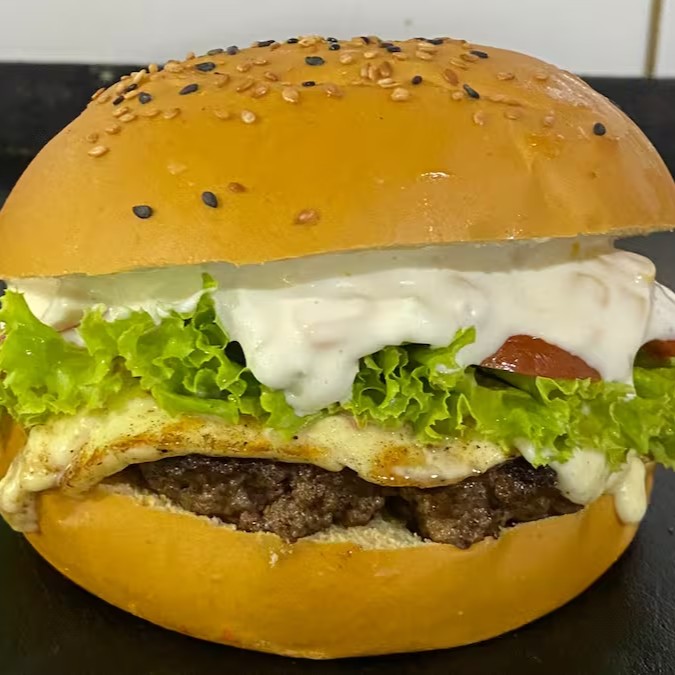 Pão monstro, 140g de hambúrguer artesanal, queijo prato, presunto, ovo, calabresa, alface, tomate, cebola caramelizada, maionese amarela ou creme de milho
