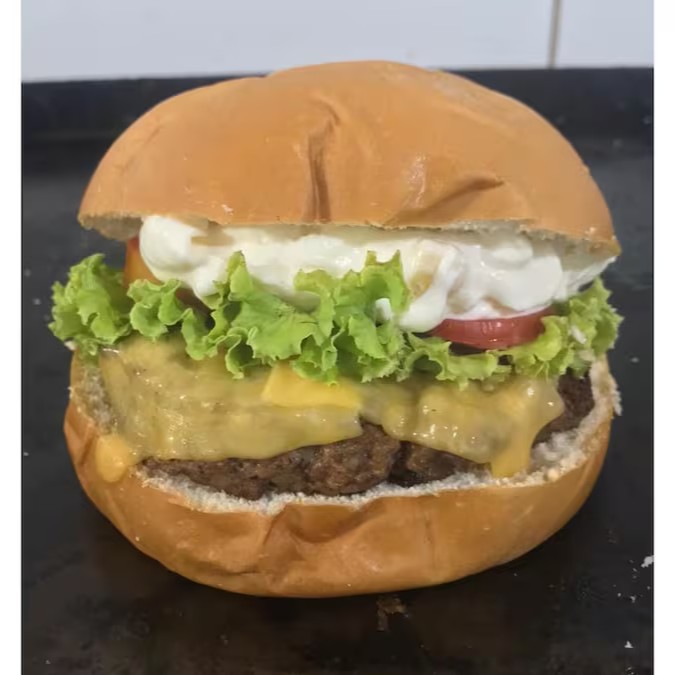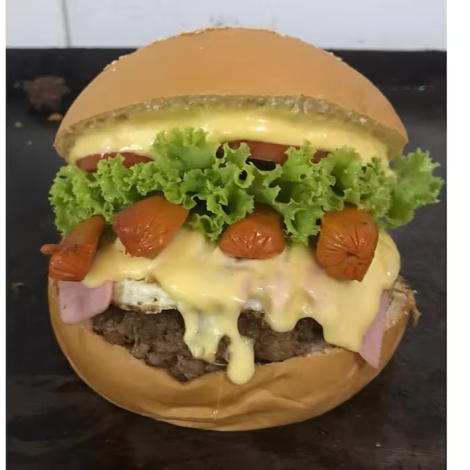 Pão monstro, 140g de hambúrguer artesanal, queijo prato, presunto, ovo, salsicha, calabresa, bacon, alface, tomate, cebola caramelizada, maionese amarela ou creme de milho