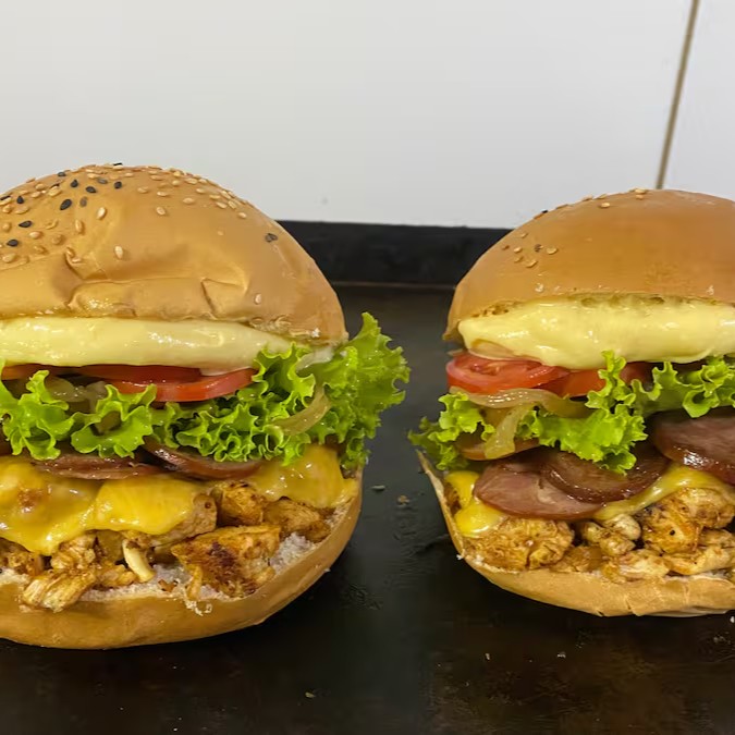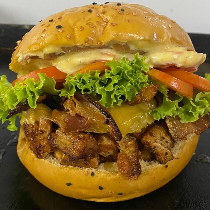 Pão Monstro, frango em cubos, queijo prato, bacon, alface, tomate, cebola caramelizada, maionese amarela ou creme de milho.