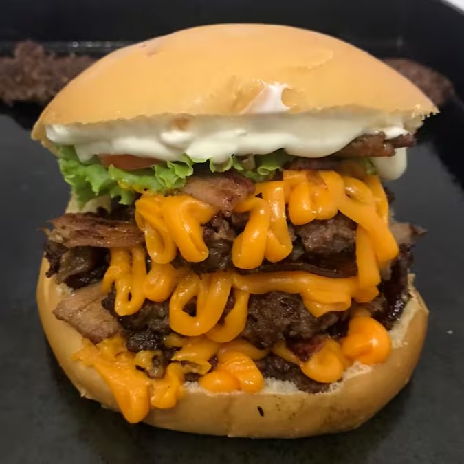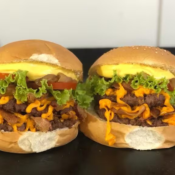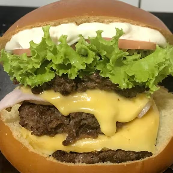 Pão monstro, 2 hambúrgueres artesanais de 140g cada, 2 queijo cheddar, 2 bacon, alface, tomate, cebola caramelizada, maionese amarela ou creme de milho