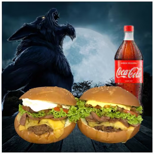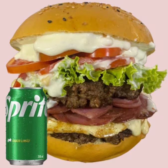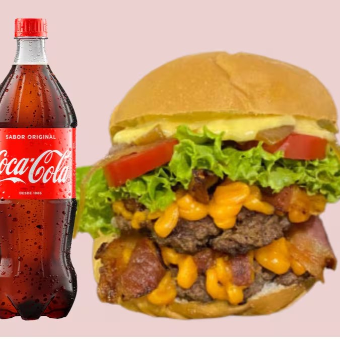 Pão monstro, 2 hambúrgueres artesanais de 140g cada, 2 queijo cheddar, 2 bacon, alface, tomate, cebola caramelizada, maionese amarela ou creme de milho + coca litro