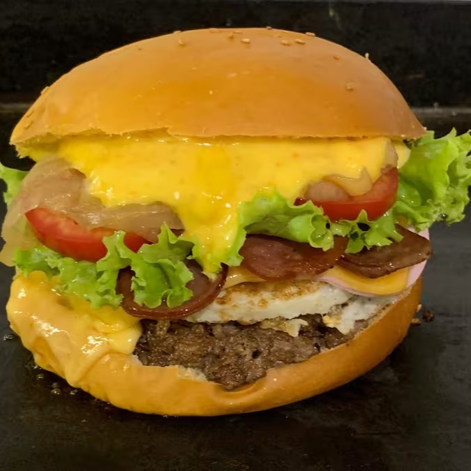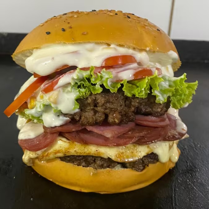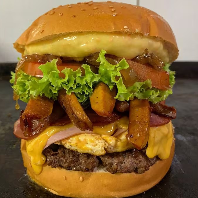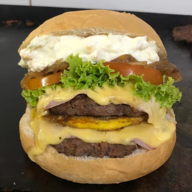 Pão monstro, 3 hambúrgueres artesanais de 140g cada, 2 queijo prato, 2 presuntos, 2 ovos, alface, tomate, cebola caramelizada, maionese amarela ou creme de milho