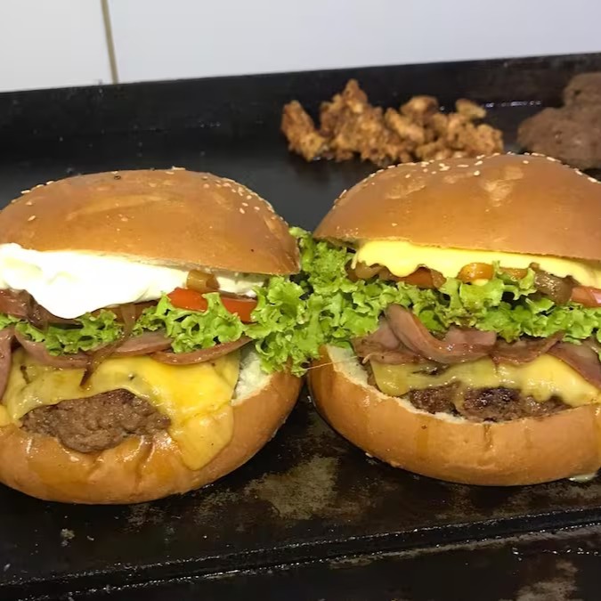 Pão monstro, 2 hambúrgueres artesanais de 140g cada, 2 queijo prato, 2 presuntos, ovo, alface, tomate, cebola caramelizada, maionese amarela ou creme de milho
