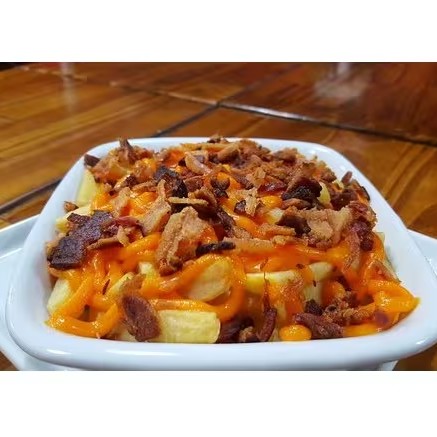 300g de batata frita com sal, queijo ralado, cheddar e bacon