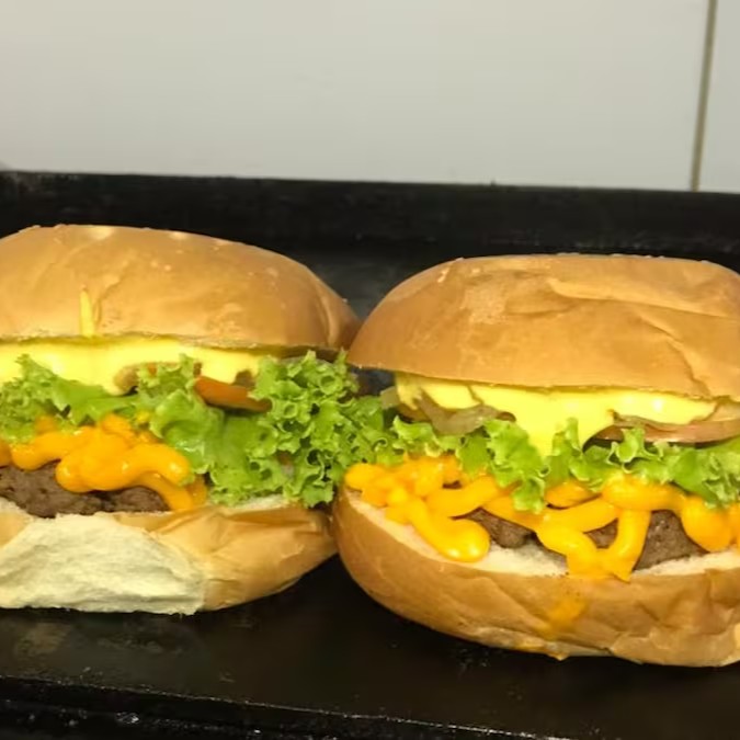 Pão monstro, 140g de hambúrguer artesanal, queijo cheddar, alface, tomate, cebola caramelizada, maionese amarela ou creme de milho